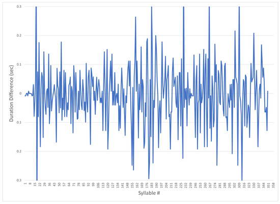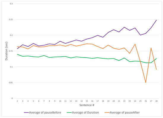Section 4 mentioned that an important part of the data extraction from the source audio files was determining the position of the spoken syllable within the phrase (group of syllables). Figure 6 shows three duration elements of a spoken syllable in seconds: The syllable itself in green, and the pauses before (in purple) and after the syllable (in orange). The y-axis shows the duration in seconds and the x-axis represents the sequence number of the sentence. When reviewing the duration of each identified syllable from the source data in Figure 6, the average duration of each syllable decreases as the phrase number increases—this is understandable, as the samples are time limited to a maximum of one minute each, and with more phrases per sample it is expected that the duration must reduce.