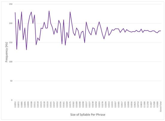 Figure 7 shows the average on the y-axis, while the x-axis has the relative size of the syllable compared to the phrase: For example, a size of 0.5 is a two syllable phrase, and a size of 0.125 is an eight syllable phrase. Figure 7 shows that syllables in the source data that are a larger portion of the phrase average occur at a higher frequency, while syllables that are smaller components of the spoken phrase have higher variance. This may be because of vocabulary differences between different speakers or perhaps intonation of shorter words naturally tends to high frequencies.