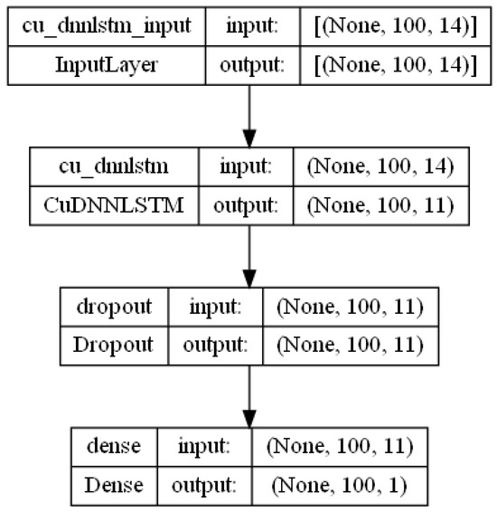 There is an LSTM-per-feature output prediction, resulting in five multivariate LSTMs; each is a unidirectional sequential LSTM. The number of layers and nodes per layer were investigated by recording the loss function by epoch: anything that was too ‘square’—in that the loss function recorded no further loss after just a few epochs—was disregarded due to overfitting, and gradients that did not appear to regress to a minimum were also discarded. The final model size is reported in Section 5.