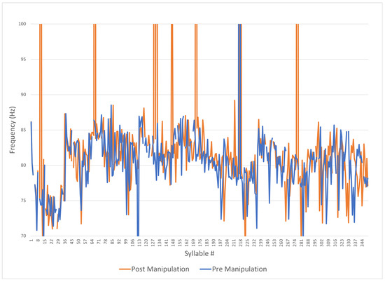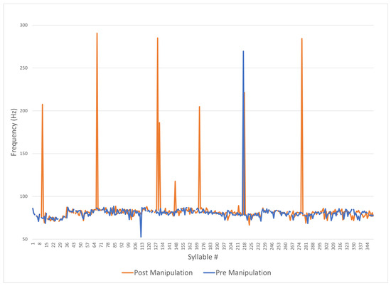 The largest differences between the original audio and that post-manipulation is in the intensity level, measured in decibels (dB). The prosodic version has almost double the dynamic range—the interquartile range of the original audio is 49.9–53.1 dB, whereas the range of the prosodic audio is from 61.8 to 67.8 dB. This change in dynamic range adds an element of realism to the monotonous speech, as real speech shifts in intensity as phrases are spoken. If both the input and output waveforms are overlaid with the axes shifted this becomes clearly visible: similarly to Figure 11, the shape of the original waveform’s intensity is visible, which demonstrates that the authentic voice is being retained.