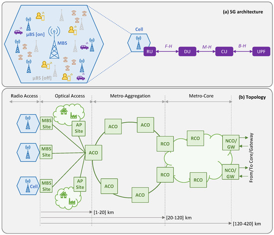 In the RAN, we assume that a cell consists of a single macro BS (MBS) and a number of micro BSs (µBSs). MBSs provide full coverage within their cells and provide the minimum capacity to absorb users’ traffic, whereas µBSs complement the capacity of the MBS within a limited area of the cell. We assume that µBSs provide two operational modes: (i) active, where the µBS is switched on and fully operational, and (ii) sleep, where the µBS is switched off. Without loss of generality, we assume that the radio units (RUs) on both the MBS and the µBSs provide support for e2e traffic flows. RAN cells provide radio connectivity to the UE and require one of the following main service classes [23]: (i) enhanced mobile broadband (eMBB), (ii) ultra-reliable low-latency communications (URLLC), or (iii) massive Internet of Things (mIoT). It is worth mentioning that eMBB typically requires a large capacity (~150 Mb/s per UE and service) with relaxed e2e latency requirements (~4 ms from the UE to the core). Conversely, the URLLC service has very stringent latency requirements (~1 ms) and reduced capacity. Finally, mIoT is typically highly distributed, which entails the management of a large amount of UE injecting moderated bandwidth (in the order of tens of Mb/s) with intermediate target e2e latency assurance (~2 ms).