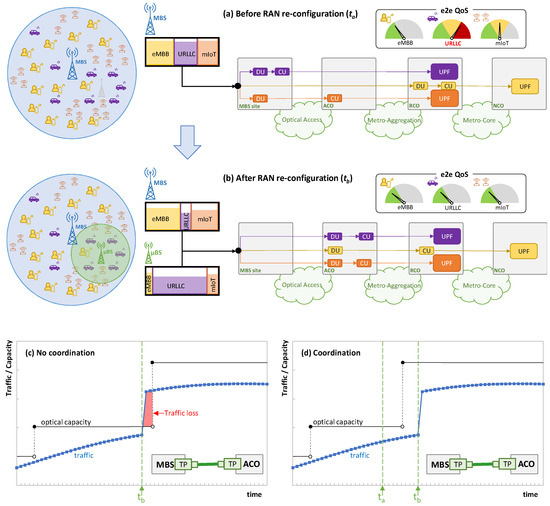 It is worth noting that the change in the transport network traffic between time ta and tb cannot be predicted by typical monitoring and data analytics control loops in the fixed network [15], since the reason for that change is uncorrelated with the previously observed traffic. To better illustrate this problem, Figure 3c sketches the autonomous operation of an access optical connection between the MBS site and the ACO following a typical control loop, such as the one proposed in [15], and in the event of the smart RAN operation exemplified in Figure 3a,b. Based on traffic prediction, optical capacity (in the granularity of optical subcarrier units) can be smoothly adapted to traffic changes so that the service is guaranteed and the capacity (and transponder energy consumption) is minimized. However, due to the lack of coordination between network domains, once the RAN reconfiguration is performed (at time tb), the traffic suddenly increases in the optical access, which can lead to traffic loss until the optical capacity is reactively extended. Hence, in order to overcome this problem, some contextual information about the slice operation needs to be provided to the transport network orchestrator before it actually happens (at time ta) so that the latter can prepare the fixed transport network accordingly. This is illustrated in Figure 3d, where the anticipation of the RAN reconfiguration can be added to the process of predictive optical capacity allocation. Note that, according to this assumption, the optical capacity can be increased before the optical access traffic actually changes. Although this action might produce some overprovisioning of the optical capacity between times ta and tb, the benefits in terms of traffic loss mitigation outweigh the need for coordination.
