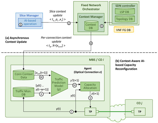 Context-aware autonomous network operation scheme containing: asynchronous context update (a) and context-aware AI-based capacity reconfiguration (b).