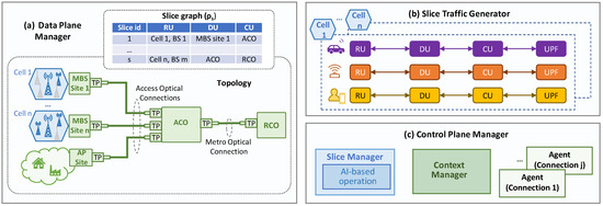 Figure 5 shows the main blocks and components implemented in the simulator. It contains a data plane manager (Figure 5a) that simulates a topology consisting of a number of RAN cells, all of them individually connected to a reference ACO by means of access optical connections (i.e., each optical connection transports traffic from a single RAN cell). Then, the traffic received at the ACO (that aggregates several RAN cells and the fixed access traffic) is propagated to the reference RCO by means of a metro optical connection. Without loss of generality, we assumed point-to-point optical connections, each supported by a number of sub-carriers of 25 Gb/s each [15]. In conjunction with this topology, a set of slices is served, each identified by the graph ρs, which allows the mapping of each slice function with a computing node (we assume one single computing node per MBS and CO).