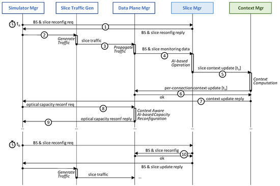 The last phase to reproduce at every time step involves the reconfiguration of the optical capacity of the connections with the prediction expected for next time step t + 1, which now can be performed with an updated context (8). Thus, the agents of the connections perform context-aware AI-based capacity reconfiguration, as explained in Section 4, and then notify the manager when finished (9). This concludes the execution of a time step. Note that, at time step tb, the request of the BS and slice reconfiguration produces changes in the network, which need to be executed (10) before continuing with the traffic generation and propagation phases.