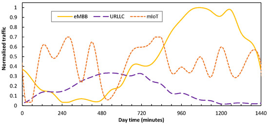 Regarding RAN configuration, we considered RAN cells consisting of 1 MBS working at the sub-6 GHz band (2 × 2 MIMO, 20 MHz bandwidth, 30 KHz subcarrier spacing, and 55 PRBs), and a variable number of µBSs configured in the mmWave band (8 × 8 MIMO, 100 MHz bandwidth, 30 KHz subcarrier spacing, and 275 PRBs). Without loss of generality, we assumed that every active BS has one slice per service class. Moreover, the F-H and B-H traffic were computed according to the formulation and references in [18]. Figure 7 illustrates the UE traffic demand per service class (normalized to maximum) in a typical day as a function of time; this was obtained according to the assumptions in [22] and [28] for a medium-term scenario. As can be seen, eMBB presents a clear peak in the afternoon/evening time, whereas URLLC inversely increases in the morning/noon period. Regarding mIoT, it fluctuates with peaks and valleys distributed throughout the whole day. Overall, the percentages of the traffic of each type are 45%, 15%, and 40% for eMBB, URLLC, and mIoT, respectively.