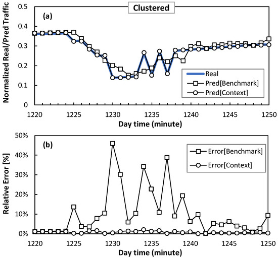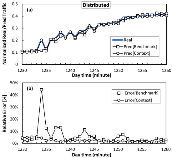 Next, regarding the error convergence performance obtained in Figure 10, where a stable prediction error for both the benchmark and context models is reached, Figure 11 and Figure 12 show a detail of the performance of the traffic prediction for one of the sudden traffic changes introduced by smart slice operation in clustered and distributed scenarios, respectively. The figures show real traffic and predicted traffic using both benchmark and context methods, as well as the relative error. Note that benchmark prediction presents large inaccuracies (errors around 50%) in the presence of those sudden changes. Conversely, the context model provides accurate and smooth prediction since it anticipates sudden changes thanks to context information.