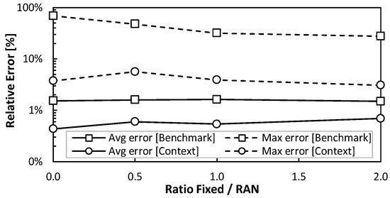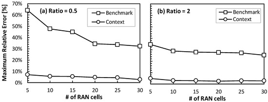 Let us now focus on evaluating the accuracy of the traffic prediction for a metro optical connection connecting an ACO with its reference RCO. Recall that this type of connection supports traffic from a number of RAN cells, as well as traffic from fixed AP sites (which typically show smoother daily patterns when mixing residential and business traffic). Figure 13 shows the average and maximum error of a metro optical connection that supports 10 RAN cells (mixing clustered and distributed scenarios) and a variable number of fixed APs. In particular, we defined several configurations with different ratios of fixed/RAN (1 means that the fixed and RAN traffic volumes are equal; 2 means that the fixed traffic is double than that of the RAN). It is worth noting that the improved prediction by the context model persists even for large ratios (i.e., when the overall traffic becomes more predictable). In other words, the sharp fluctuations induced by the RAN operation have a large impact on the aggregated flows, which validates the extension of the context update to the metro optical connections (and not only access ones). Figure 14 depicts the evolution of the maximum relative error as a function of the number of RAN cells for ratios 0.5 and 2. In line with the previous results, the error reduction achieved by the context model is outstanding. Indeed, the benchmark model produces relative maximum errors of 30% in optical connections supporting large traffic volumes, which can have a large impact in terms of absolute errors (dozens to hundreds of Gb/s).