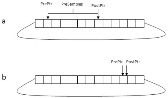 (a) Just after an event occurrence, the distance between PostPtr and PrePtr is equal to the number of Pre-Trigger samples. Afterwards, samples are transferred to the output FIFO. PostPtr is advanced every time a new sample is available, and PrePtr is advanced at every FPGA clock cycle, so it eventually reaches PostPtr (b) and then advances in step with it. Only when the sampling clock is equal to the FPGA clock (125 MHz) does the distance between the two pointers remain unchanged.