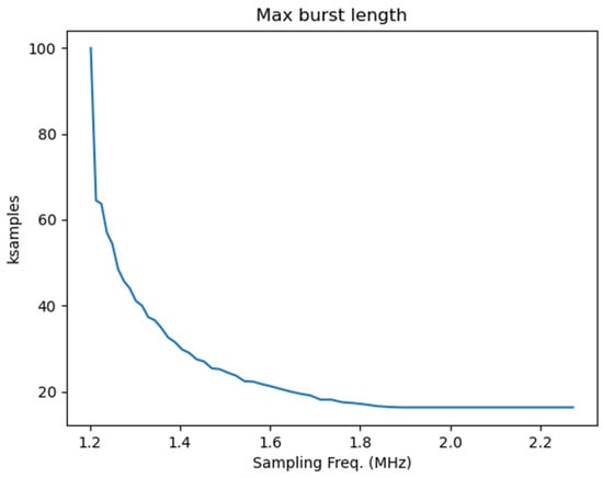 When using the second option, DMA-based data transfer is normally not feasible because the whole DMA transfer must be terminated before its data can be used for control computation. This introduces a delay in the data availability that may not be tolerable in control. For this reason, direct FIFO readout may be required, i.e., reading data samples from the FIFO as soon as they are available. This solution reduces latency and jitter in data readout but introduces a penalty in data transfer throughput because several CPU cycles are required for reading every data sample. Figure 2 provides an indication of the data throughput that can be achieved with direct FIFO readout. In the figure, the maximum burst length that can be achieved without FIFO overflow is shown at different sampling rates. For the highest sampling rates (up to 125 MHz), the maximum burst length corresponds to the FIFO size because, in this case, the data acquisition speed is much higher than the speed at which the FIFO is read by the processor. When the sampling rate decreases, the burst size can be larger than the FIFO size because at the same time as data are acquired and written to the FIFO, they are concurrently read by the processor. For sampling rates less than 1.2 MHz, the average data readout exceeds the data sampling rate, and sustained data transfer can be achieved. It is worth noting that only in sustained data transfer, i.e., at a sampling frequency less than 1.2 MHz, is feedback control guaranteed not to suffer delays in data availability due to the internal buffering. In this case, as soon as a sample has been stored in the internal circular buffer, it will be transferred to the processor before a new sample is acquired.