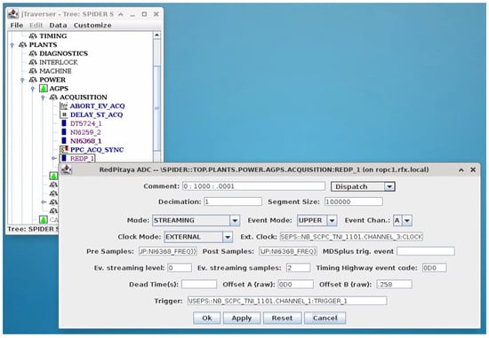 The flexibility of the Zynq architecture of the RP boards allows the easy integration of acquired data into a more general data acquisition system. Once transferred in the processor memory, either in DMA or via direct FIFO readout, data from the different RP boards can be transferred over the network to a central data acquisition system and thus become accessible for analysis and display. This approach has been followed in the integration of the RP boards in the NBTF test facility and pushed further by storing in the experiment database not only the acquired signals, but also the configuration of the RP boards. This has been made possible by allowing every RP board to be remotely configured via TCP/IP. Interfacing all the involved RP boards in the data acquisition and management system used in the experiment greatly simplified their usage because it was possible to rely on the user interfaces provided by the central data acquisition system for board set-up and to use the visualization tools to display the acquired signals. An example of the interface is shown in Figure 3, where a specific form is activated when selecting the corresponding item in the graphical configuration browser of the experimental set-up.