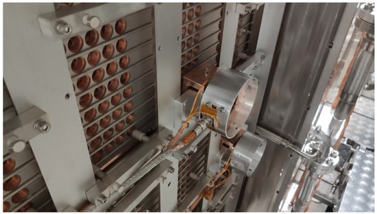 Beamlet currents in different positions have been measured using two different configurations of the RP board. Continuous data acquisition provides information about the average current density and uniformity [], whereas the event-driven acquisition provides information about the beam current fluctuations (MHz range) due to the plasma oscillations produced by the RF field generating the plasma [,]. Two different sensors have been used for continuous and event-driven data acquisition, respectively, as shown in Figure 5. Closed Loop Direct Current Current Transformers (DCCT) (1) have been used to measure the DC/low frequency components of the beamlet current, while current transformers (2) have been used to measure the high-frequency components [,].