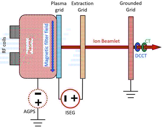 A simplified scheme of the NBTF experiment showing both the main parameters affecting the measured current and the location of the beamlet current sensors is reported in Figure 6. The negative ions are produced inside an Ion Source by ionization induced by Radio Frequency (RF) field (via RF coils), then the ions are extracted from the ionized gas (Plasma) and accelerated by an electrostatic accelerator composed of three grids (Plasma Grid, Extraction Grid and Grounded Grid). The ions are extracted from the Ion Source (biased by the AGPS power supply with respect to ground) by the Extraction Grid, which is biased with respect to the Plasma Grid by a dedicated power supply (ISEG) and accelerated up to the last grid (Grounded Grid) of the accelerator. The transverse magnetic filter field, controlling the negative ion density in the proximity of the Plasma Grid, is also shown. The sensors measuring the beamlet currents located downstream the Grounded Grid in some specific locations are also shown.