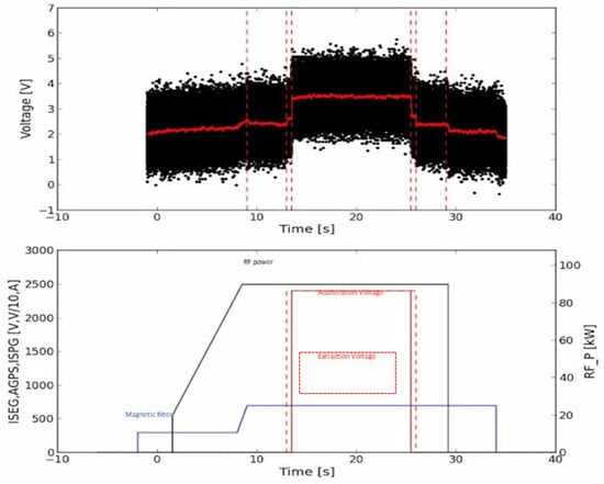 In Figure 7, an example of the application of the continuous acquisition mode, implemented by the RP boards, is reported. The capability of this system to correlate the measurements collected from different sensors with other Experiment Parameters is particularly useful for data analysis, providing a powerful tool for the sensors’ integration into the experiment. The figure clearly shows how the RP board, able to record and store and synchronize the measurements in the Experiment database, is a powerful tool to clearly identify how the pulse parameter affects the measured quantity from a given sensor (a DCCT sensor, in this case). In the figure (top), the output voltage of the sensor is shown and compared with the main parameters of the pulse (Acceleration Voltage, Extraction Voltage, Magnetic filter field and Radio Frequency power).