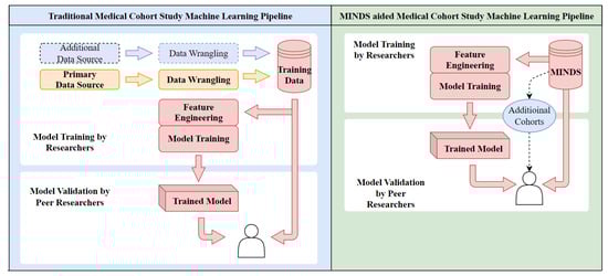 In the first stage, data is obtained from a primary source that may consist of patients who comprise the bulk of your study. Still, access to additional data sources may be needed to augment the original dataset, which may be restricted, or a minimal amount of such data that aligns with the original cohort may be present, limiting the ability to develop comprehensive models. Once collected, both sets undergo their respective data wrangling. It can be time-consuming and resource-intensive when new data sources are introduced due to different data cataloging and formatting pipelines. Next, the model development phase consists of feature engineering and model training. However, once developed, the model’s effectiveness is limited by the scope of the original dataset. Validating and expanding existing models with new data sources requires extensive data wrangling and matching the data pipelines of the original researcher, leading to longer validation times and decreased productivity. Consequently, the broader applicability of these models remains unexplored mainly, limiting the potential for advances in understanding complex diseases and developing effective treatments. In contrast, MINDS integrates multimodal data into a unified platform, and researchers can employ early-stage data fusion techniques that can harness the rich potential of correlated multimodal data to improve inference and decision-making. For instance, in the context of medical applications like cancer research, the integration of MR, X-ray, and ultrasound imaging data with different modalities of data acquired not from scans, such as histopathology slides, can yield more accurate and comprehensive insights into patient conditions compared to relying on any one modality alone.