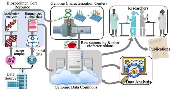 - Genomic Data Analysis: The raw data from the previous stage is then transformed into meaningful biological information at this stage. In CCG, the Genomic Data Analysis Network (GDAN) transforms the raw data output from the GCCs into biological insights. The GDAN has a wide range of expertise, from identifying genomic abnormalities to integrating and visualizing multi-omics data [].