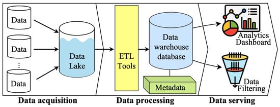 Data warehouses represent a foundational pillar of the big data paradigm. A data warehouse integrates heterogeneous data from diverse sources into a centralized, well-organized repository to enable analysis. This repository provides a highly structured environment explicitly optimized for analytics, reporting, and deriving insights across vast information []. By fulfilling this role, data warehouses deliver immense value in informed decision-making. The process of assembling data into warehouses is called data warehousing. “Schema-on-write” is the core concept employed, where the warehouse schema is predefined to meet specific analytical needs before data is loaded. This upfront structural optimization makes warehouses ideal for handling structured data. Supervised machine learning thrives in warehouses, as structured, consistent data facilitates training algorithmic models. Moreover, the innate high degree of organization enables fast, efficient querying to uncover trends and patterns through predictive analytics []. Overall, by structuring varied data sources into a unified environment purpose-built for analytics, data warehouses provide the backbone for deriving value from big data across many domains.