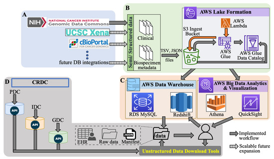 Overview of the MINDS architecture implemented on AWS. (A) Data from multiple oncology sources is acquired. The pipeline for structured data is currently configured with GDC, with the ability to integrate other platforms, such as the University of California Santa Cruz Xena and cBIO portals. (B) The structured data from the source is acquired in an AWS Lake where multiple components such as S3 Bucket, Glue, and Lambda catalog and process the data. (C) Next, the Data Warehouse uses RDS and Redshift for structured data warehousing in the form of relational schema. The cataloged data is available to Athena and Quicksight for analytics and visualization. (D) The users can directly query the structured data for visualization. All unstructured data download pipelines using the Data Commons APIs from Cancer Research Data Commons (CRDC) are also shown. Using SQL queries, users can request all modalities data associated with the cohort. Resultantly, all the data from PDC, GDC, and IDC are pulled together, harmonized, formatted, and presented to the user ready to use for machine learning pre-processing.