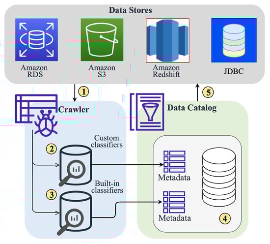 - Amazon Web Services. Data Catalog and Crawlers in AWS Glue. Available online: https://docs.aws.amazon.com/glue/latest/dg/catalog-and-crawler.html (accessed on 1 March 2023).