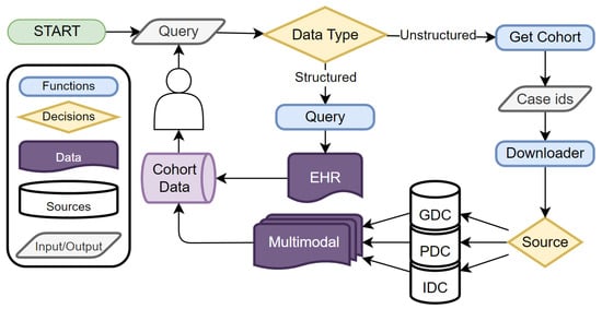 Traditionally, vast amounts of multimodal data are generated during clinical trials and research studies where raw data undergoes initial processing and quality control by researchers. The data is then transmitted to standardization pipelines such as the National Cancer Institute’s (NCI) Center for Cancer Genomics (CCG) Genome Characterization pipeline [], where the data is systematically annotated, formatted, and quality-controlled before being deposited into centralized biobanks. For example, NGS data from cancer genomic studies is standardized by CCG and deposited into the NCI’s Genomic Data Commons (GDC) []. However, imaging data from the same studies, consisting of CT, MRI, and PET scans, follow a different path and may end up in imaging archive like The Cancer Imaging Archive (TCIA) []. This leads to fragmentation of data across multiple disconnected databases. To address this, integrated data commons like the NCI Cancer Research Data Commons (CRDC) have been proposed []. The CRDC aims to link datasets from diverse sources using Findable, Accessible, Interoperable, and Reusable (FAIR) principles to enhance interoperability [].
