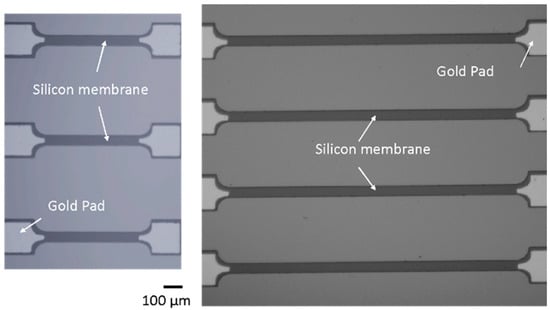Microscopic images of the fabricated silicon membrane-based strain sensors of different sizes on SOI wafers, transferred to polyimide substrates for AE and strain measurements. The membrane thickness varies from a few hundred nanometers to a few microns.