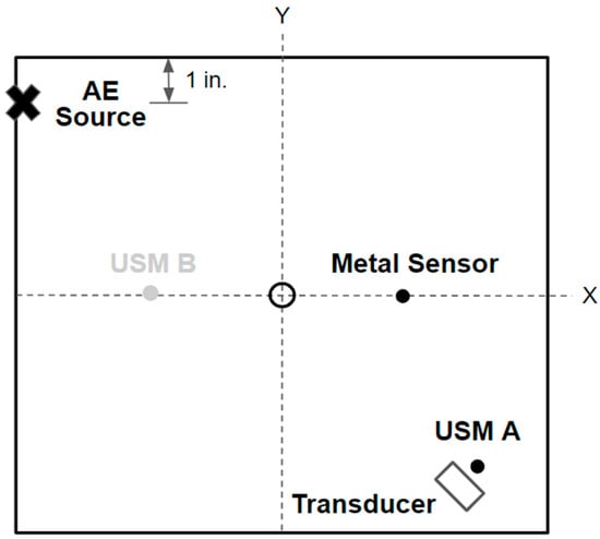 Schematic representation of the acoustic emission testing experimental setup. Testing was performed on some aluminum 6061-T6 12-inch square plate with 0.087-inch thickness.