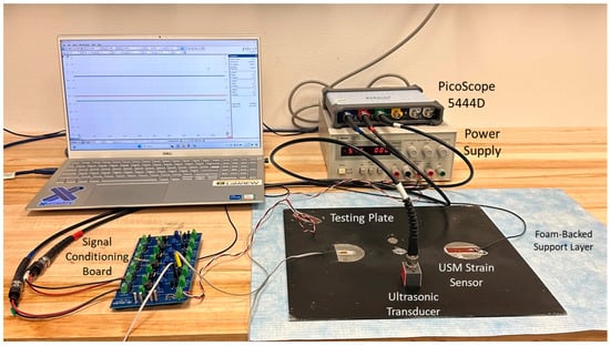 Figure 4 shows the experimental setup utilized in the acoustic emission testing. The thin aluminum plate with the mounted strain and ultrasonic sensors is laid flat on a foam-backed support layer. The strain sensors (USM- and metal-based) signals went directly to the signal conditioning board, which was supplied with ±5.7 V of power by an external power supply. The board is based on a Wheatstone bridge configuration to convert the change in strain sensor resistance to an amplified output voltage. Strain sensor leads are taken as the input (USM- or metal-based), and the board utilizes a potentiometer to balance the bridge. An INA118 instrumentation amplifier is used with a ~1 kΩ gain resistor in order to set the amplification gain to approximately 51 for the output signal. The output of the signal conditioning board is sent to the PicoScope 5444D for data acquisition. The ultrasonic transducer output went directly to the PicoScope. We collected data for 50 ms at 17.86 MHz to ensure the entire AE signal and any subsequent reflections were captured, and that any aliasing effects were avoided. A rising slope trigger was placed on the transducer signal to begin the data acquisition.