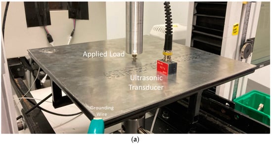 Figure 5 presents a schematic for the quasi-static plate bending experimental setup, where a simulated point load is applied perpendicularly to the plate’s center using an Instron 3369 machine. The plate rests on a custom-made static plate holder to provide a simply supported plate boundary condition. Since USM sensor “B” is closer to the center loading of the plate, it is subjected to a greater bending stress and, therefore, outputs a greater response to the loading. For this reason, USM sensor “B” was utilized for this test. To ensure both the USM strain sensor and the ultrasonic transducer are subject to the same loading, the plate was flipped upside-down, and the transducer was placed directly over top of the USM sensor, as illustrated in Figure 6. The difference in tension versus compression is accounted for in post-processing by multiplying the transducer data by a negative one.