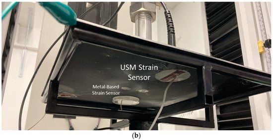To have a true “dual application” sensor capable of both AE and bending strain measurements, it is necessary for the sensor to operate on a wide-frequency bandwidth. The USM strain sensor’s ability to document low-energy, high-frequency acoustic emissions was demonstrated in the previous section; however, to evaluate the sensors’ responses to bending strains, both sensors were subjected to quasi-static loading at various loading rates. This, in turn, evaluates their potential for wide bandwidth, dual sensing applications.