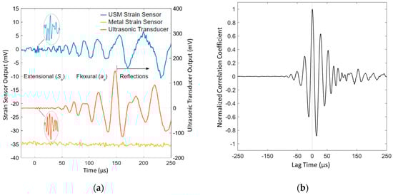Time domain analysis of the USM strain sensor response to acoustic emissions compared to an ultrasonic transducer generated by a Hsu–Nielsen source. (a) The recorded AE signals plotted as a function of time. The USM strain sensor signal (blue trace) and the commercial metal-based strain sensor (yellow trace) are plotted on the same left y-axis scale; the commercial 2.25 MHz broadband ultrasonic transducer (orange trace), is plotted on the right y-axis scale. Measured AE signal characteristics (extensional and flexural modes) are labeled along with subsequent plate-end reflections, beginning at approximately 150 μs after the first strain arrival. The signals were digitally filtered with a Gaussian-weighted moving average filter. (b) Normalized cross-correlation between the filtered AE signals of the USM strain sensor and the ultrasonic transducer for the 100 μs preceding and 150 μs following the first strain arrival.