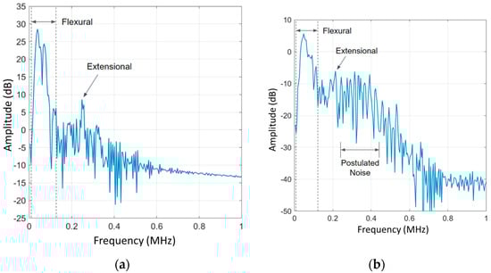 PSD of the filtered AE data from both sensor types, where 0 dB is 1 mW into 1 Ω. (a) Ultrasonic transducer PSD of recorded AE with labels denoting flexural vs. extensional mode frequency content. (b) USM strain sensor PSD of recorded AE. High-frequency content beyond the extensional mode frequency range is attributed to EMI in the sensor signal and noise in the signal conditioning board [27].