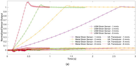 The respective sensor responses to this loading are shown in Figure 9a. The USM strain sensor outputs a steady linear response to the constant deformation of the applied load across the four loading rates. A clear differentiation in sensor response slope is noticed across the various loading rates, due to the sensor’s sensitivity to bending. The commercial metal-based strain sensor documents a similar linear response to the loading, but at a lesser magnitude due to the lower gauge factor. Additionally, the overshot of the applied load is captured for each loading rate test. This overshoot, which is seen to be greater in the faster speed tests, is caused by an overshoot in the prescribed maximum load by the load frame machine; this is confirmed by the respective loading curves [27].