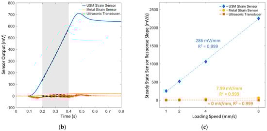 To further analyze the respective sensors’ performance with bending strains, Figure 9c plots the respective sensor response slope during this region of quasi-static loading as a function of the applied loading rate. The resulting data points for the USM strain sensor are used with a simple linear regression model to create a linear best fit line with a slope of 286 mV/mm, denoting a great change in the sensor response as a function of plate displacement. The regression model is met with a strong linear correlation with a coefficient of determination (R2) of 0.999, demonstrating the USM strain sensor’s sensitivity to the bending strain and in differentiating loading rates. The metal-based strain sensor also demonstrates the ability to differentiate the loading rates a high degree of accuracy, achieving an R2 of 0.999. However, it exhibits sensitivity levels over an order of magnitude lower compared to other sensors, with a linear best fit slope of 7.99 mV/mm. The ultrasonic transducer, however, provides a near-zero linear best fit slope with an R2 of 0.311, denoting little-to-no correlation in sensor responses and applied loading rates. This testing further demonstrates the transducer’s inability for quasi-static bending strain sensing (and therefore, its inability in the dual application sensing of both high-frequency and quasi-static loading cases), and further highlights the USM sensor’s potential for dual-application sensing.