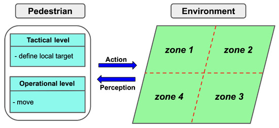 When entering a new zone, pedestrians adjust their tactical and operational models to align with the requirements of the corresponding zone. To ensure a generic and extensible approach for various pedestrian-simulation models, an agent-based model is proposed in