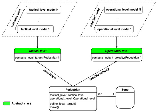 Each modelling algorithm for each level needs to inherit the corresponding abstract class. The Tactical level and Operational level classes return the local target and feasible velocity for pedestrians, respectively. What should be noted here is that in the simulation environment, excluding the Pedestrian class, only one single instance of each class is created (singleton pattern). Therefore, our model does not increase complexity but improves the flexibility of simulation. Furthermore, it is possible to change the modelling algorithm at each level of behaviour by simply updating the variables and in the Pedestrian class.