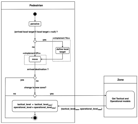Figure 3 illustrates the activity diagram of pedestrian agents at each simulation step. Initially, the agents perceive their surrounding environment to identify neighbouring agents. Subsequently, if the agents have either reached their current local target or do not have a local target, they execute