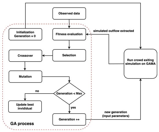 Figure 9 presents the flow of the calibration process executed using the GA. An individual, which represents a set of parameters, is input into the crowd exiting simulation on the GAMA platform [