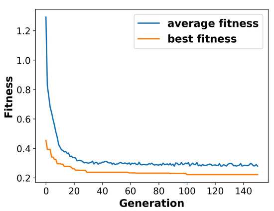 Figure 10 shows the average fitness value and best fitness value of the population over 150 generations. It can clearly be seen that the average fitness exhibits an exponential decrease in the first 10 generations. Then, it declines gradually until generation 35, where it stabilises for the remaining duration. Similarly, the best fitness value of the population drops rapidly until generation 30 before reaching a stable state.