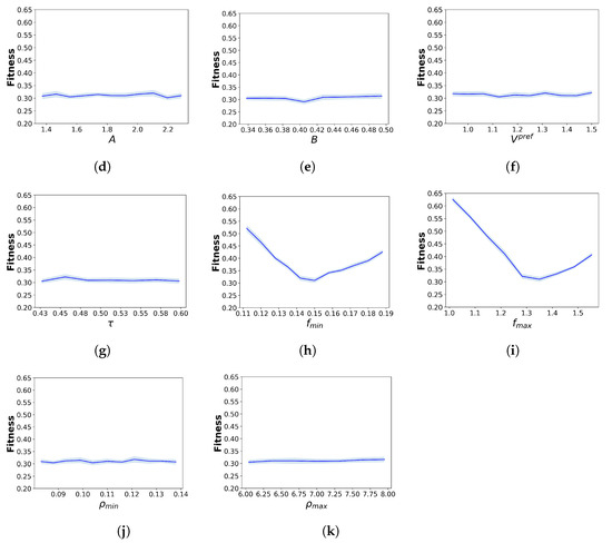 On the other hand, for the parameters of the pedestrian-simulation models, the sensitivity results differ between the SFM and CC models. For the parameters of the SFM, the fitness values remain largely unchanged, indicating that the SFM parameter variations do not substantially affect the fitness value and the outflow results. For the parameters of the CC model, only those parameters specifying pedestrian speed, including and , exhibit strong sensitivity to the fitness values, with a rapid increase when these parameters deviate from their calibrated values. In contrast, the parameters and have almost no impact on the fitness value.