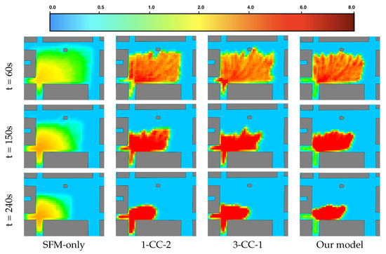 t = 60 s, 150 s, 240 s). In the SFM-only model, the highest density area, with a maximum density of