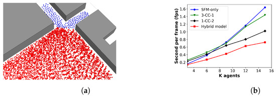 Figure 14b, indicate that the SFM-only and 3-CC-1 models have the longest simulation times, which increase significantly as the number of pedestrians grows, while the 1-CC-2 model has a similar simulation time to them at first but drops as the number of agents increases. In contrast, our model demonstrates superior performance in terms of simulation time, with a large difference from the other models observed as the number of pedestrians grows. This finding indicates that using mesoscopic models for low-density regions is unnecessary, and they can be replaced with microscopic models. These results suggest that having different modelling algorithms at each level not only improves the variety of behaviour observed in various scenarios but also enhances overall performance compared to using only microscopic models or multiple mesoscopic models.