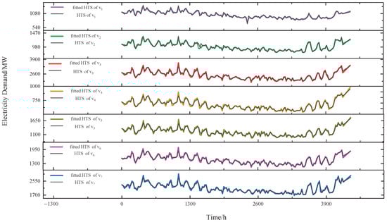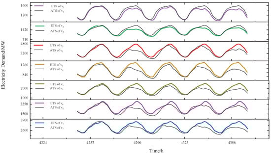 ARIMA combines the concepts of autoregression (AR), moving average (MA), and the operation of differencing the time series signals. Specifically, the autoregressive part represents the relationship between the current value of a variable and its value at p previous moments, where p denotes the autoregressive order. The moving average part represents the relationship between the current value and the error (white noise) at q previous moments, where q denotes the moving average order. The d-order differencing operation is performed to remove trends and seasonality from HTSs. Therefore, an ARIMA model is used to fit the trend and periodicity of the HTS by choosing appropriate parameters ( p , d , q ) to make forecasts of the ETS [29].