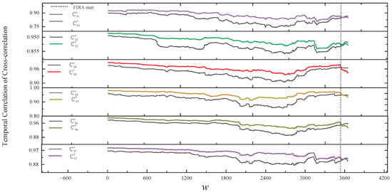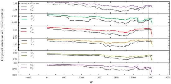 Here, c o v ( R i ( T , w ) , R j ( T , w ) ) represents the covariance between R i ( T , w ) and R j ( T , w ) ; δ ( R i ( T , w ) ) and δ ( R j ( T , w ) ) represent the standard deviations of R i ( T , w ) and R j ( T , w ) , respectively. Then, the time series of the cross-correlation of v i and v j can be represented by
