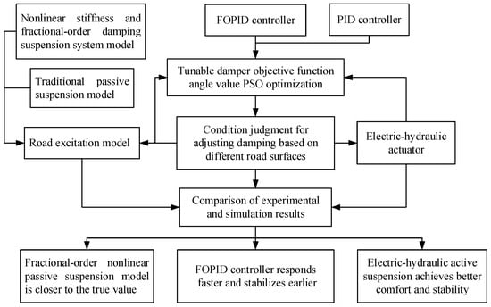 To meet the comfort and stability requirements of active control with fractional-order nonlinear suspension under multiple road conditions, new fractional-order nonlinear mathematical models and matching degree accurate control algorithms are very necessary [24]. This paper consists of five parts. Section 1, Introduction, which points out some concepts and the current research status; Section 2 contains the mathematical and physical model construction of vehicle suspension system, road conditions, electric oil and gas actuators, etc.; Section 3 gives the design of the FOPID and the optimization of the objective function; and Section 4 completes the computation, simulation, and experimental implementation and discussion. Finally, some comments will be indicated in the Conclusions section. In the following sections of the article, specific details are offered. Shown in Figure 1 are the technology routes of the paper.