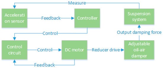 The design of the electric oil–air active suspension used in this paper is mainly based on an oil–air damper with adjustable damping. The suspension system measures the acceleration of the vehicle through acceleration sensors and feeds the signal back to the controller. The controller manipulates the rotation angle of the DC motor through a control circuit, which in turn realizes the damping adjustment of the damper through a gearbox transmission. This process allows the actuator to output adjustable damping force, thus realizing active control of the suspension system. The workflow of the hydro-pneumatic active suspension is shown in Figure 2.