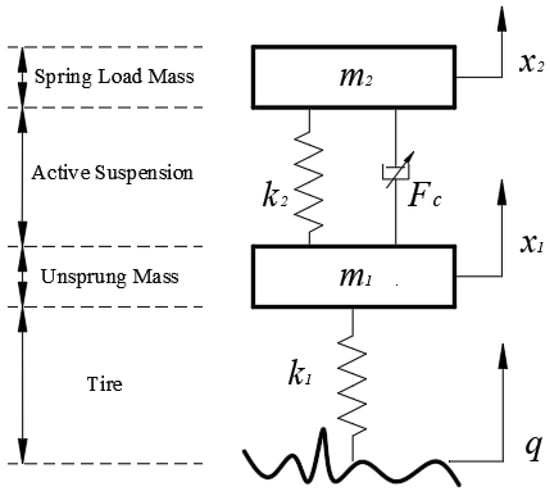 In this paper, a fractional-order nonlinear suspension system model is constructed mainly based on the viscoelastic properties of the employed adjustable-damped oil–air actuator. The constructed active model of the 1/4 vehicle suspension system [28] is shown in Figure 3 below. In this figure, denotes the elastic force output from the nonlinear elastic element, represents the sprung load mass, represents the unsprung load mass, is the tire stiffness, and q represents the road excitation.