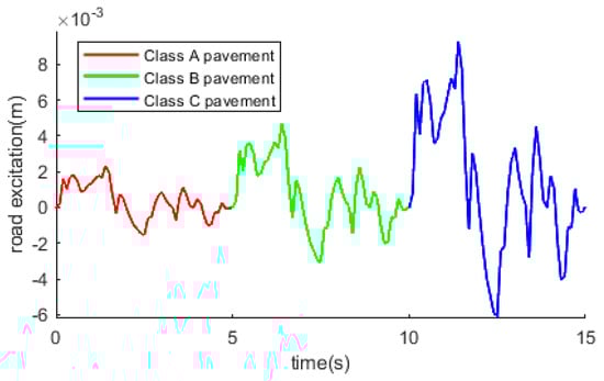 In this paper, regarding the parameters of the international standard ISO 8608 [30] for A, B, and C pavements, the three classes of pavements are combined to form the pavement excitation used in the study, and to consider only the effects caused by pavement unevenness, the pavement excitation formula is designed as shown in the following equation.