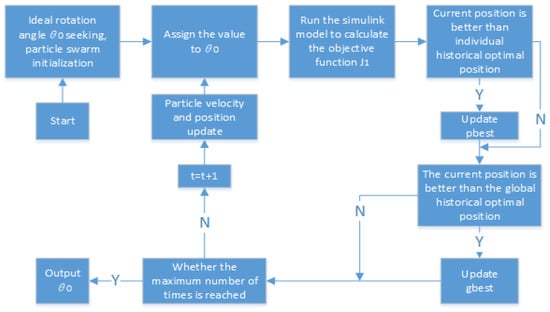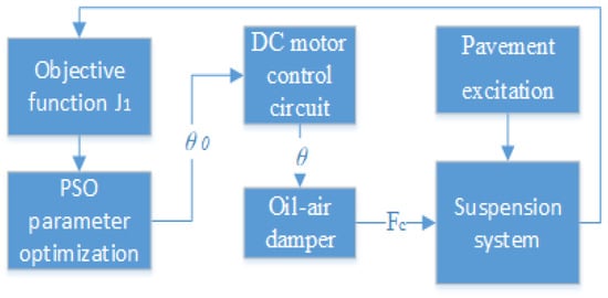 In this study, the objective function of the suspension system is optimized by using the particle swarm algorithm so that the controller outputs the ideal rotation angle parameter of the motor, and the control principle is schematically shown in Figure 7. The particle swarm algorithm is used to optimize the simple harmonic excitation objective function , with different frequencies and amplitudes to derive the parameter of the ideal rotation angle . The DC motor control circuit outputs the actual rotation angle θ according to the ideal rotation angle , and the oil–air damper adjusts the damping according to the actual rotation angle output by the motor, to realize the output of the damping force to achieve a superior suspension control effect. In Figure 7, the working principle of the DC motor control circuit is mainly demonstrated. As shown in Figure 8, the current DC motor rotation angle θ forms a deviation value from the given rotation angle , and the output power supply voltage U is controlled by the FOPID control algorithm, thus realizing the precise control of the DC motor rotation angle.