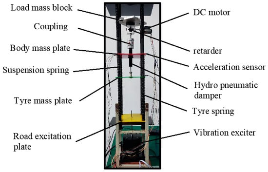 To verify the feasibility of the designed FOPID position feedback control in an electric-hydrocarbon active suspension system, the body acceleration, suspension dynamic deflection, and tire dynamic loads in the passive and active control states were simulated and experimentally investigated. The constructed test rig for the active suspension system is shown in Figure 18 below. This study aims to evaluate the performance of FOPID control in a real active suspension system to gain a more comprehensive understanding of its potential for improving vehicle dynamic characteristics.
