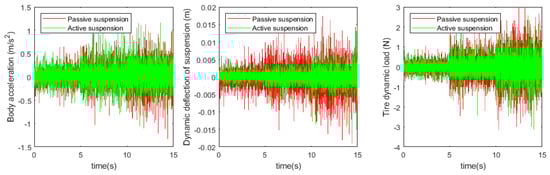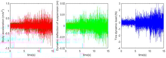 According to Equation (30), the total damping coefficient of the suspension system is the optimal damping coefficient obtained by parameter search when the road surface unevenness is , which corresponds to level A of the road surface. For the road surface unevenness , the total damping coefficient of the suspension system is the best damping coefficient obtained by parameter optimization, which corresponds to level B of the road surface. In case of , the total damping coefficient is the best damping coefficient obtained by parameter optimization, which corresponds to the suspension system at level C. The damping coefficient is the best damping coefficient obtained by parameter optimization. This means that the damping coefficient can be flexibly adjusted according to changes in road smoothness, allowing the suspension system to achieve a more stable damping effect under all road conditions.